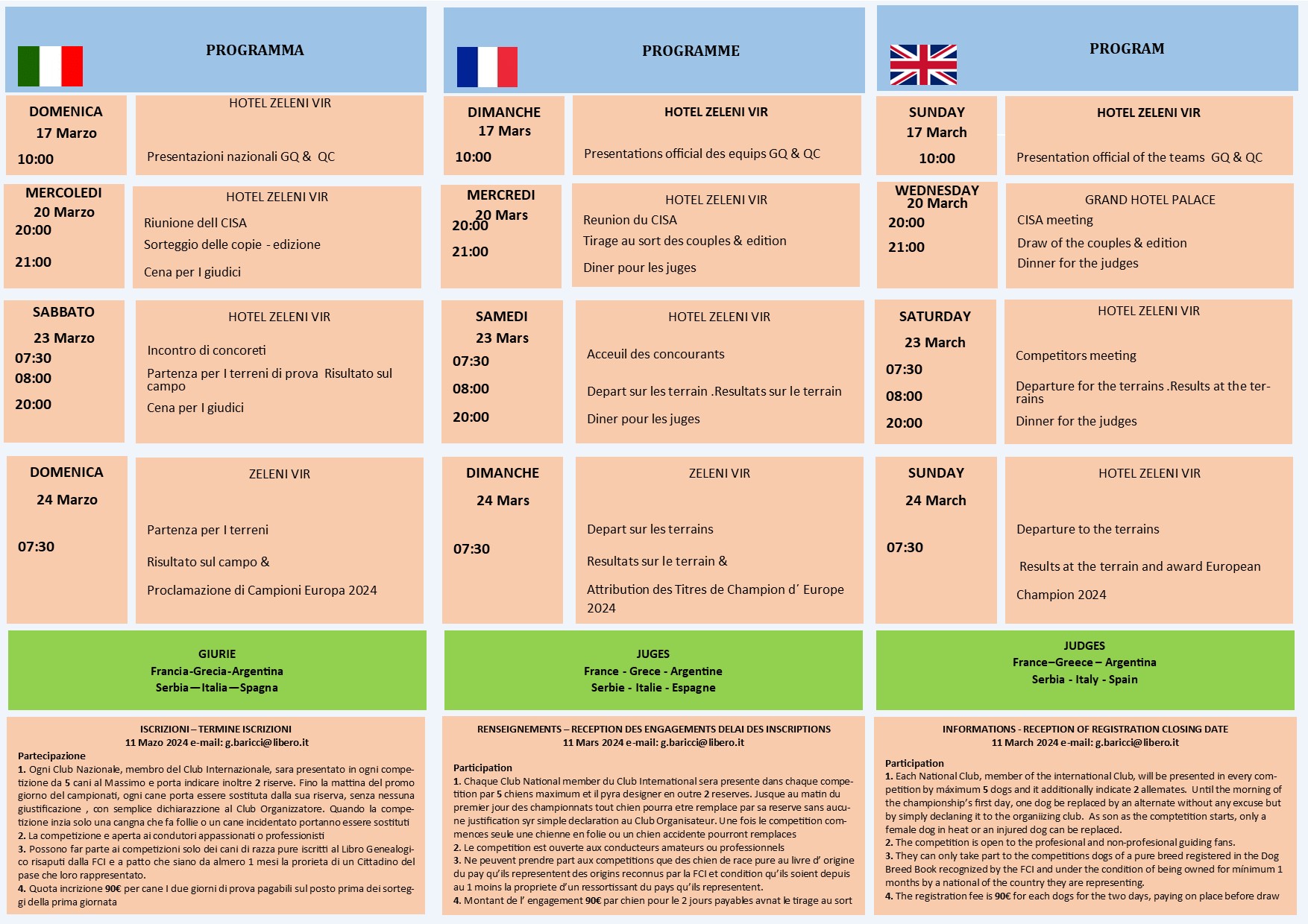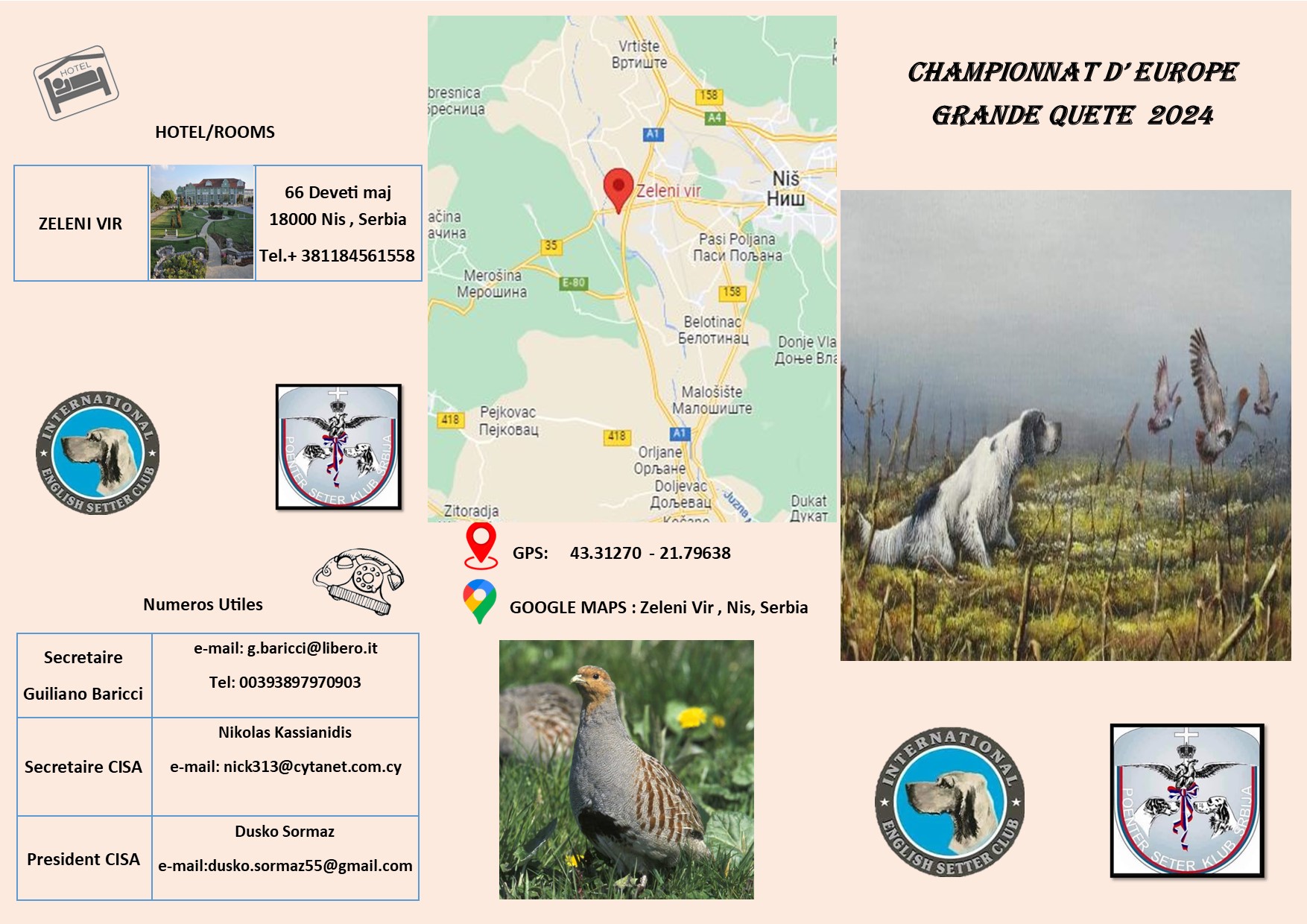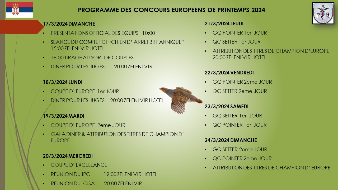 Van 21 t/m 24 maart zal er in Nis (Servië) het Championnat d'Europe Setter Anglais plaatsvinden. Leden van de VES die hieraan deel willen nemen, kunnen zich melden bij